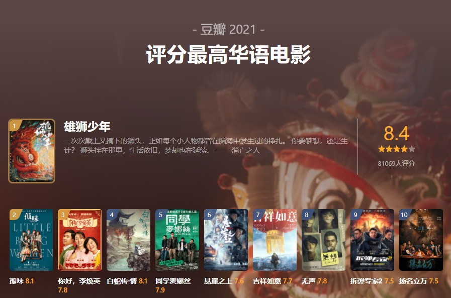 《雄狮少年》在豆瓣年度电影榜单,是评分最高华语电影 电影快讯 12月23日 叶少侠SBKK电影达人 取消关注 关注 私信 近日豆瓣2021年度电影榜单揭晓,《雄狮少年》领衔评分最高华语电影,《心灵奇旅》领衔评分最高外语电影,《觉醒年代》位居评分最高大陆剧集榜首。豆瓣年度电影榜单:《雄狮少年》是评分最高华语电影疫情下的世界依旧不安,所幸在银幕前我们得以看向一处,在同一个故事里找到真实、温暖和感动。全球电影票房1376亿元,中国电影票房456.7亿元,占全球票房33%,位居世界首位,年度票房前十有3部为中国电影。国内全年放映总场次11900万场,观影人次12亿次,同比上升106%。文章链接:https://www.sbkk.net/newsflashes/9739.html文章标题:《雄狮少年》在豆瓣年度电影榜单,是评分最高华语电影文章版权:随便看看 (sbkk.net) 所发布的内容,部分为原创文章,转载请注明来源,网络转载文章如有侵权请联系我们!